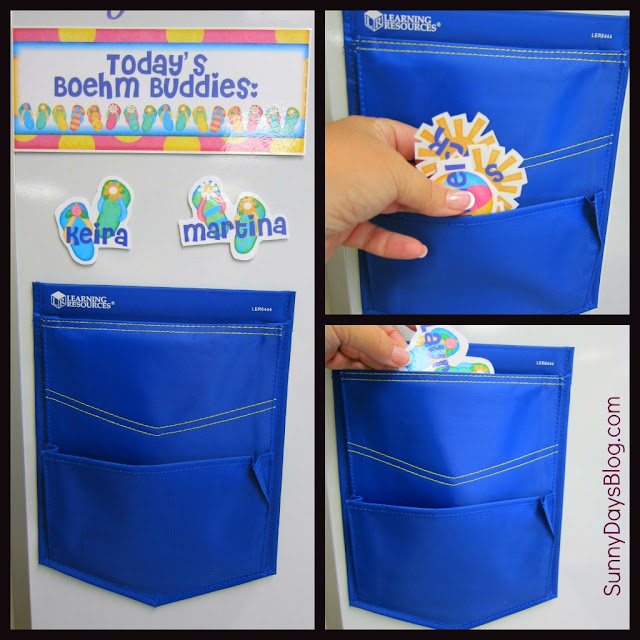 This is on the front whiteboard. That magnetic pocket is awesome for this. I actually had it for a while and wasn't sure how to use it. I printed all of the kids names on cute little graphics and added a magnet to the back. Now all the kids who have not had a job yet live in the front pocket. After a kid has a turn at being a Boehm Buddy, their name goes in the back pocket until all have had a turn, then we start over again.
